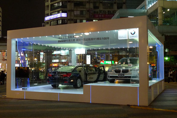 全球熱賣的全新BMW大7系列,自2009年在台上市以來,憑藉著雍容華貴的優雅氣質、精密尖端的創新科技、無人能及的駕馭動感和超越同級的舒適豪華,贏得各界一致肯定與讚賞,成為引領豪華旗艦性能房車發展的新標竿。BMW總代理汎德公司以前衛創意的方式,設立一座獨特巨型透明玻璃裝置藝術,即日起至2011年1月2日止,於台北市捷運忠孝復興站站前廣場,展示2011年式全新BMW 740Li尊榮版與全新BMW ActiveHybrid 7豪華油電旗艦,佇立在熱鬧的台北街頭,不但要吸引路過民眾注意力,更企圖展現全新BMW 7-Series精緻細膩的設計與精湛動力的表現。