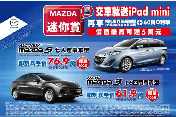 Mazda為回饋消費者,即日起至本月底止推出「Mazda迷你賞」購車優惠,凡於活動期間入主New Mazda3或All New Mazda5車款並完成領牌交車手續者,即可獲得蘋果iPad mini 16G Wi-Fi版白色,搶先體驗最新潮流平板電腦,讓消費者不僅開最具品味的Mazda新車,同時手拿iPad mini走在時尚科技尖端!再享領先業界6年或15萬公里七大系統延長保固,及60萬元分期零利率專案,三項優惠總值最高可達五萬元!