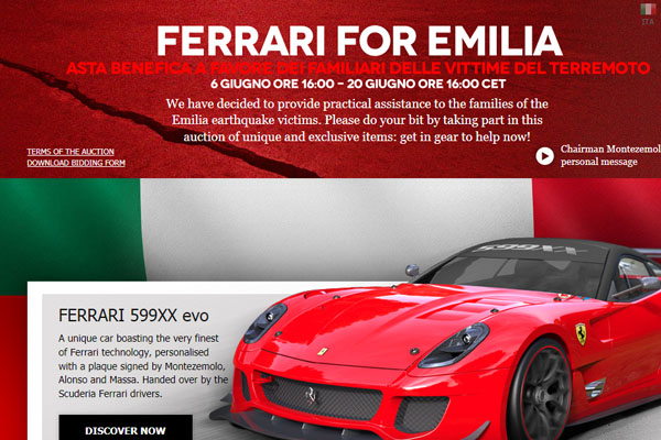 為在義大利Emilia-Romagna地區最近地震的受災家庭籌集資金, Ferrari主辦的國際線上慈善拍賣於6月6日16:00(歐洲中部時間)正式開始。世界各地的Ferrari車主、收藏家及廣大Ferrari愛好者們都將能夠通過 www.ferrari.com 做出自己的貢獻。