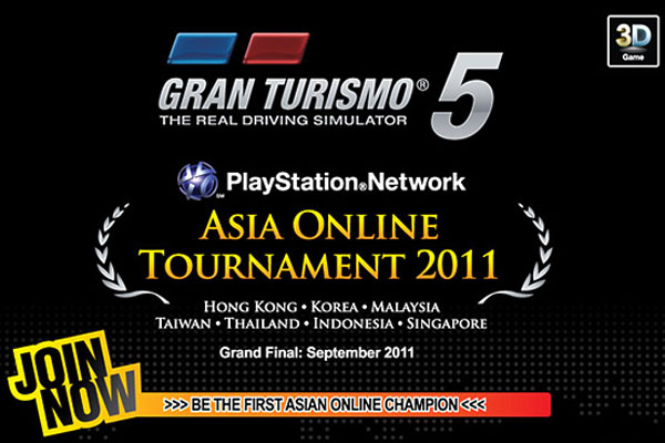 PlayStationR3專用遊戲軟件『GRAN TURISMOR5 跑車浪漫旅5 (GT5)』亞洲網上賽即將在PlayStationRNetwork (PSN)舉行,各位車手快準備啟動引擎,在賽道上施展出類拔萃的賽車技術,爭奪價值超過NT$40,000的豐富獎品!