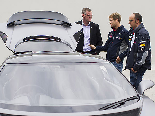 在2013年F1英國大獎賽前的空檔,Sebastian Vettel與INFINITI Red Bull Racing F1車隊工程師參觀位在英國的INFINITI歐洲科技中心。