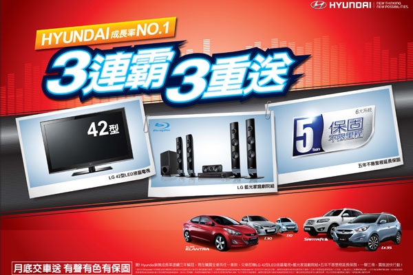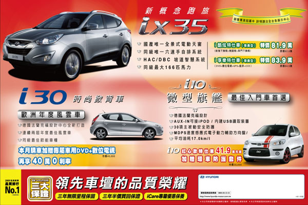 景氣回春車市一片看好,又逢農曆年前汽車市場大旺季,各大車廠無不磨刀霍霍,Hyundai在今年中有了ix35熱銷的加持,整體營運逐漸獲利,為了掌握市場利基,特別針對〝i系列〞車款規劃出一系列優惠專案搶頭香!,為今年13000台的銷售目標達成而努力。