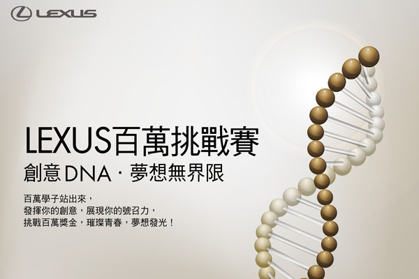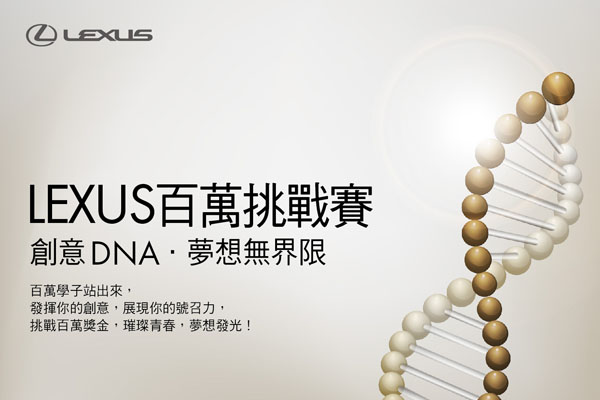 由Lexus總代理和泰汽車主辦、財團法人純青社會福利基金會贊助的「Lexus百萬挑戰賽-創意DNA‧夢想無界限」活動即將於4月23日起正式開跑。和泰汽車希望藉此「百萬圓夢」競賽鼓勵台灣學子能盡情發揮創意,勇於挑戰不可能,進而實現青春璀璨夢想,擁有不一樣的人生。歡迎各大專院校學子踴躍參與,爭取百萬獎金及至Lexus企業實習的機會。