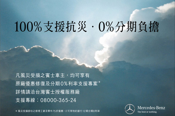 中度颱風凡那比直撲台灣、並帶來強烈雨勢,已經造成數十鄉鎮之淹水災情。台灣賓士關懷全台M-Benz與smart車主,立即推出服務方案;凡回廠即獲風災受損部份之維修工資及零件75折優惠,另可享有台新銀行、花旗銀行、玉山銀行、以及中國信託等特約銀行推出之12期分期0利率方案,以減輕維修愛車之負擔。