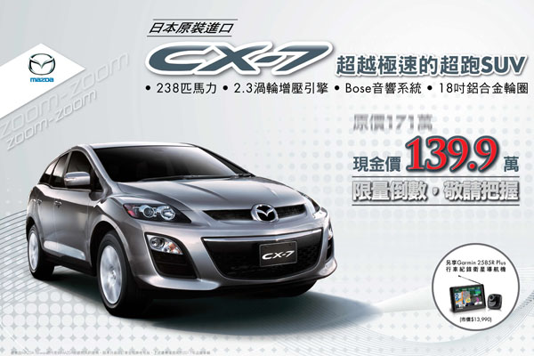 為感謝日本震災期間,Mazda Taiwan號召台灣社群網路粉絲團踴躍捐款的熱切愛心,在震災週年之際,Mazda日本原廠秉持對台灣車迷的感恩之心,特別主動提供台灣消費者一項回饋方案:針對Mazda CX-7,日本原廠大力支持台灣總代理,推出限時現金139.9萬元的感恩優惠回饋!4月底前購車並完成領牌,還可獲贈價值13,990元的「Garmin 2585R Plus」行車記錄衛星導航機,數量有限,敬請把握入主旗艦跑旅CX-7的最佳時機!