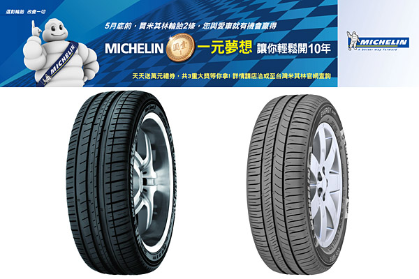 台灣米其林為使消費者能體驗米其林輪胎產品的卓越性能表現,自4月13日起至5月31日止,推出「Michelin 一元夢想,讓你輕鬆開10年」活動!
