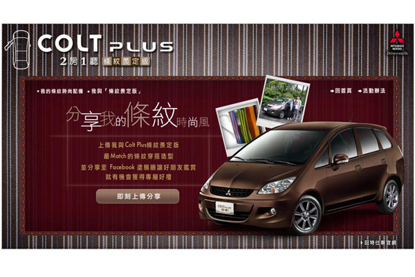 Colt Plus限量特仕車「條紋羨定版」上市傳捷報!推出短短兩周即造成市場熱銷,較好又叫座的反應讓經銷商士氣為之大振。連知名部落客wisely、winnie試過都滿意!除了購車送英倫時尚精品組,現在到展示中心,分享你與「條紋羨定版」的合照,還有機會獲得市價$ 5,940元的巧克力雲莊雙人住宿券!