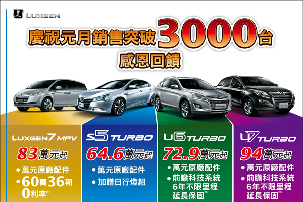 臺灣自主品牌Luxgen於一月份銷售告捷,不僅全車系領牌達3101台,市佔率排名更爬到第四名新高位置。