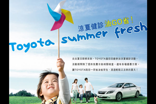 Toyota台灣總代理和泰汽車爲傳遞「對人、車」的關心,自6月1日起至7月15日止,特別舉辦『Toyota Summer Fresh』涼夏健診活動,邀請Toyota車主回廠爲愛車實施免費冷氣健康檢查。