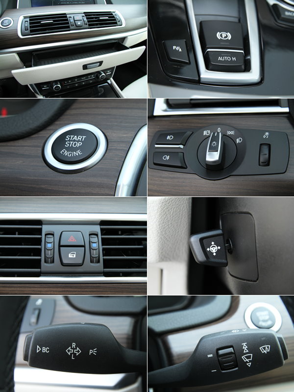 由上至下、由左至右圖說依序為控台中央的置物抽屜、引擎啟動/停止鈕、中控鎖、方向盤後左撥桿、電子式駐車系統與Auto Hold功能、燈組控制總成、方向盤四向電動調整撥桿、方向盤後右撥桿等。