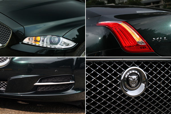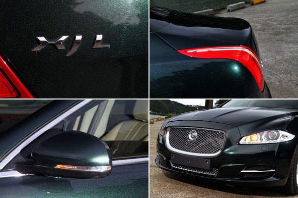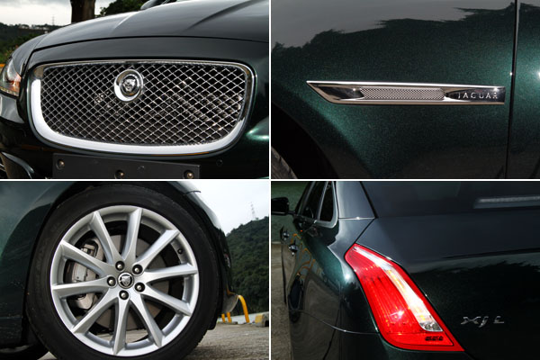依循著XF的外觀設計基礎,全新XJ在具備更大的車身尺碼後,有如將畫布加大了面積,讓原廠設計師有更大揮灑的空間,以一體化地大型鍍鉻格狀水箱護罩作為起點,由上方兩角向後拉出弧線延伸至車尾,撫平了以往引擎蓋上地貝殼曲線,簡化了視覺感受,並且以高腰線、低車高設計,勾勒出原廠所稱地「懸浮」車頂,修長地身型不會給人臃腫的感覺,反而極具有氣勢,同時還兼具有英國車獨有的氣質,相較於德系對手,XJ的吸睛效果的確更勝一籌。