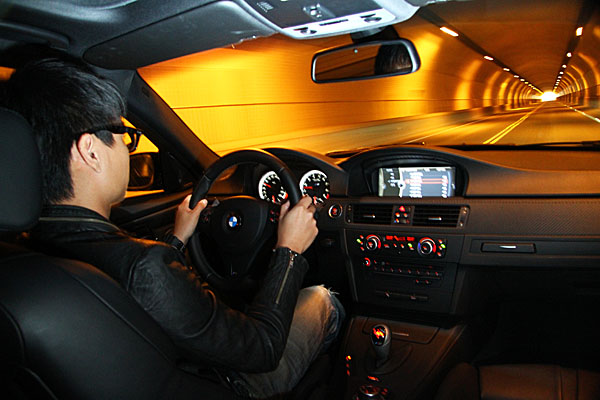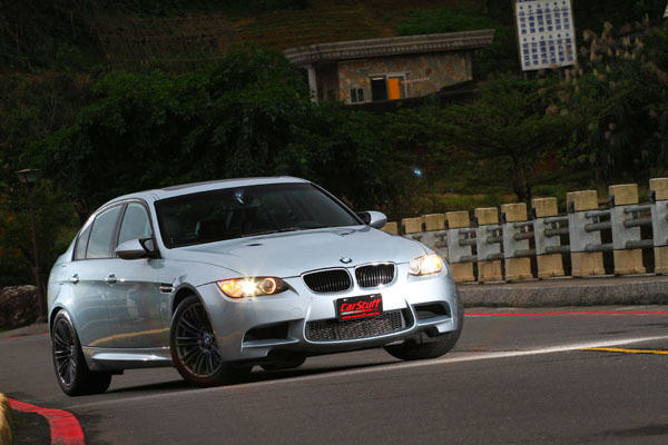 抵達選擇的試駕山區路段前,E90 M3 Sedan先接觸到的是市區道路與高架連絡道路,考量不佳路面品質與擁擠的交通流量,先將EDC設定於最軟Q的設定、POWER模式關閉、Drivelogic先從D1模式開始,在一切最「舒適」思維的設定中,E90 M3 Sedan此時是相當平易近人的,D1模式會以二檔起步,此時你無法察覺出引擎蓋下那具4.0升V8引擎的實力,就如同一般325i的表現般,輕快順暢的帶起速度;焦點轉移至下盤,以戰鬥力作為首要條件調校的懸吊系統,其實讓車內乘客吃了點苦頭,相當清晰的路感不斷傳遞至車內,且扁平的18吋胎,也難以達到適當的吸震效果,一般的路面起伏與碎震雖然還在可接受範圍內,但如果忽然來了個橋面接縫、較大坑洞,E90 M3 Sedan的硬底子,絕對會讓車上的駕乘客立刻明瞭!