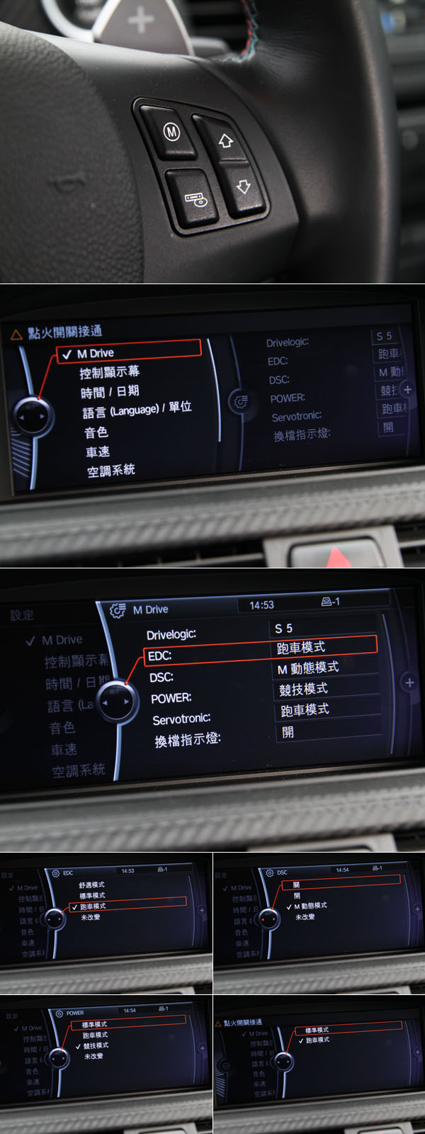 一長串介紹完後,相信很多車迷朋友會與筆者當時有著相同的混亂與疑問,如果駕駛途中,想要更換設定對應更刺激的道路,這複雜的介面,不就要將車停在路邊,好好設定一番?M GmbH當然也考量此點,因此設計了一〝M Drive〞功能,透過位於中央扶手前的iDrive控制介面,可針對Drivelogic、EDC、DSC、POWER、Servotronic、換檔指示燈的設定,混合搭配出一套駕駛最愛的設定,簡而言之,就是所謂的「快捷鍵」,從多功能方向盤的右側〝M〞按鍵啟動後,車輛就照你最愛的狀態奔馳!