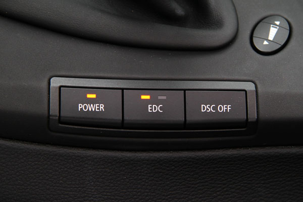 不僅如此,排檔桿的左側,還有著一排規矩排列的三個按鍵,分別為POWER、EDC與DSC OFF,除了DSC OFF清楚明瞭的提供DSC系統關閉功能外,POWER意指引擎供油曲線,EDC則為電子式阻尼控制系統,而從按鍵上的燈號顯示,POWER僅提供開/關兩模式,EDC則具備三段調整功能。