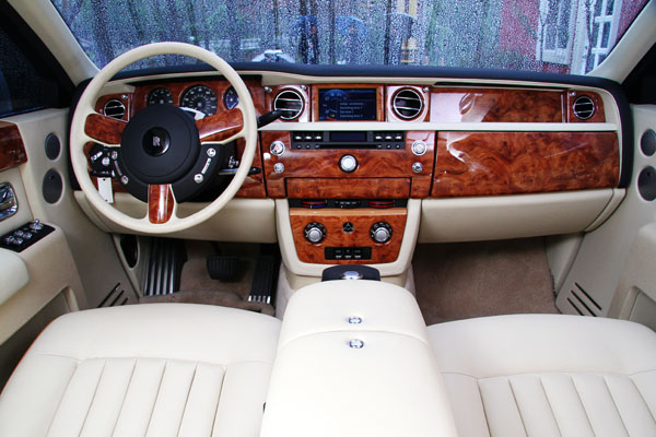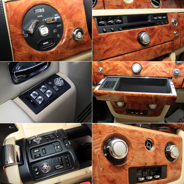 大面積的實木飾板、鍍鉻裝飾、高檔真皮等,滿佈著Phantom的車室內裝,且在此濃郁的皇室風格中,還可隱藏著諸多與時俱進的先進車輛科技於其中。