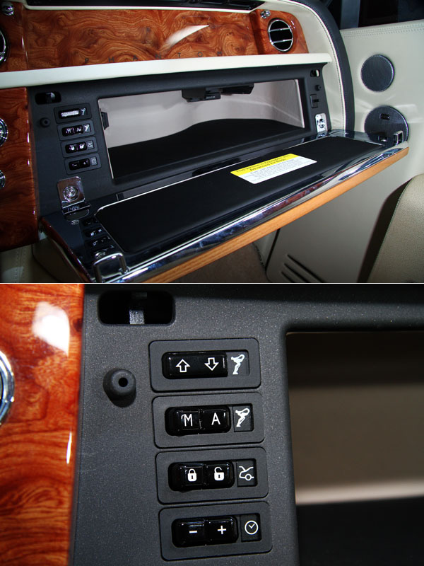 手套箱內左側還有著一排的控制介面,如車頭前的飛天女神展出或收藏按鍵、後車廂蓋鎖等。