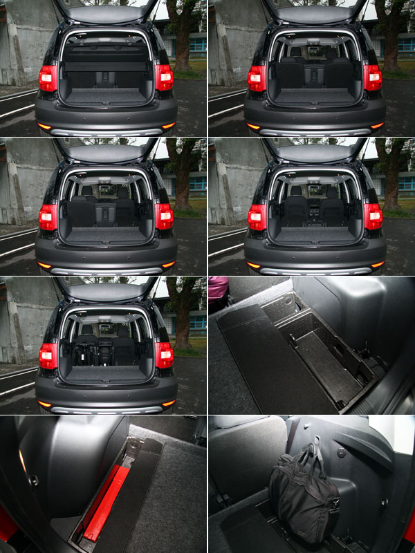 Yeti後座三張獨立座椅設計,共可有八種變化機能,讓空間運用更富彈性,行李廂中也設有置物盒、掛勾等便利設計。