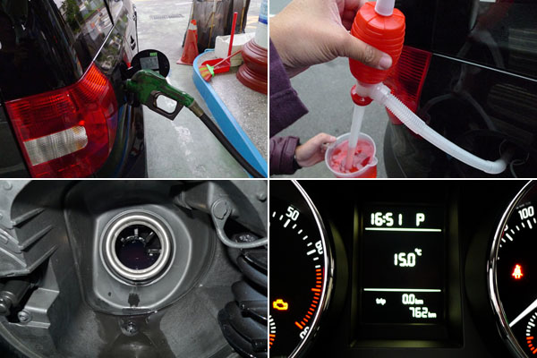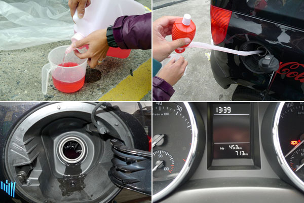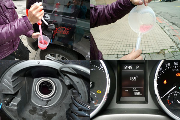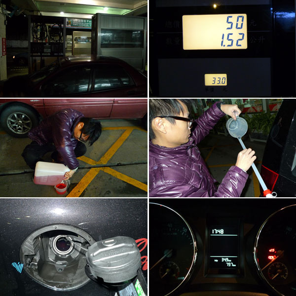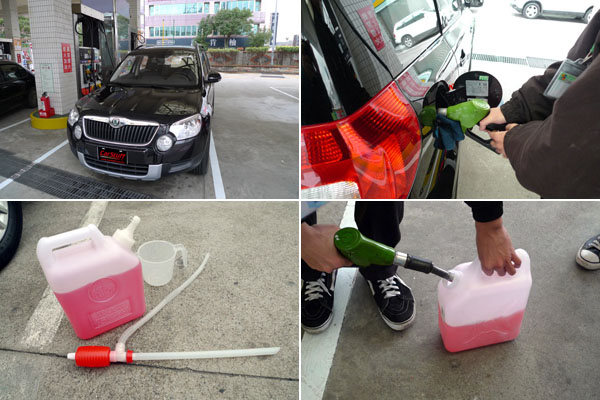 為求更精確的油耗數據,我們除了於加油站加油至跳槍外,另購買油桶、量杯與塑膠抽吸管以手工加油至加油孔。