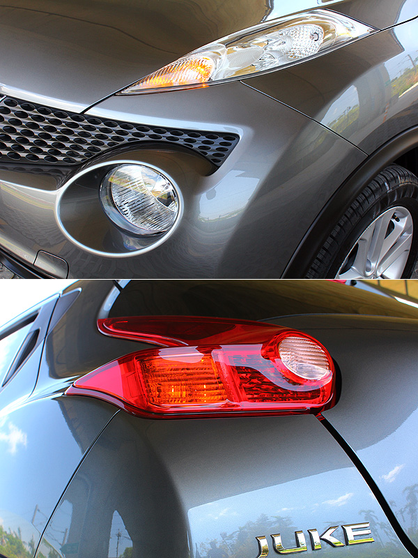 自英國遠道而來的Juke不只與Nissan家族中的其他產品有著顯著的不同,即使放在全球車壇之中,也很難不為其特殊的樣貌所吸引。特殊的頭燈設計,將方向燈、小燈與大燈分成兩組區塊配置,上方看似鳳眼的,是Juke的定位小燈與方向燈,而下方渾圓的則是肩負夜間照明大任的頭燈。透過獨到的頭燈詮釋,讓Juke有了極為突出的面容。