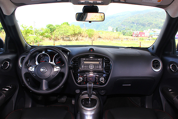 車室當中,Juke 1.6渦輪增壓車型透過運用紅色縫線、透氣皮革點綴的運動化造型座椅,搭配源自重機油箱外型的排檔座鞍部、3輻式多功能方向盤與雙筒型儀表版設計,帶來年輕氣息強烈的內裝氛圍。搭配上全車多以圓弧線條為主的鋪陳,包括中控台飾板、空調出風口與車門把手等處的輪廓勾勒,創造出活潑的車室氣氛。
