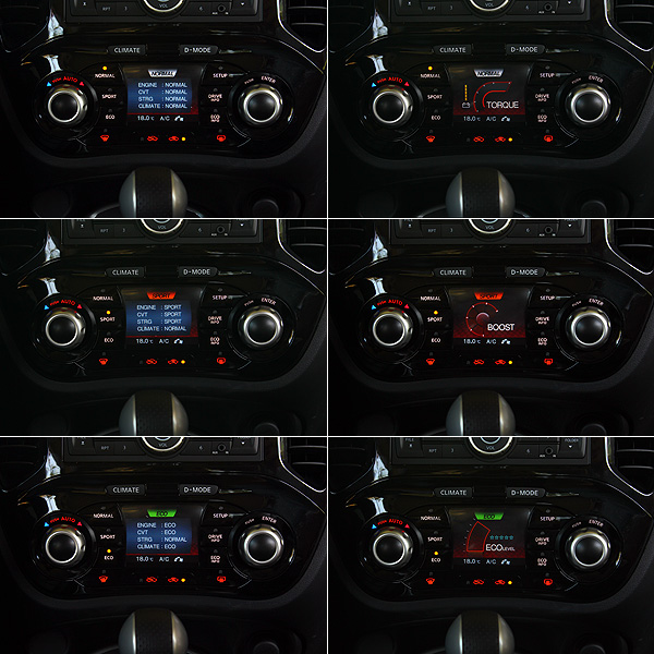 Juke擁有「Normal」、「Sport」與「Eco」等3種行車模式,能夠改變引擎動力輸出、變速箱反應、方向盤手感與空調系統設定等參數。