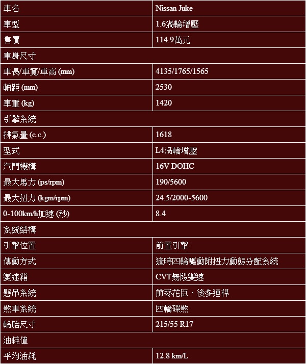 與開價84.9萬元1.6自然進氣版相比,要價114.9萬元的1.6渦輪增壓版,雖然能夠用30萬元的差價,買到多出73ps的動力輸出,以及更具運動性的內裝氛圍。但平心而論,若是與筆者相似,對於動力輸出與四驅底盤沒有太多的堅持,為Juke所吸引的理由是其極具個性的外型設計,以及散發出的年輕與特殊氣息,其實兼具油耗、溫和的動力輸出與亮眼外表的Juke 1.6自然進氣版可能會是較貼近心中期待的選擇。
