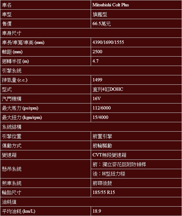 因應五期環保法規,Colt Plus在改款之後換上1.5升MIVEC引擎,搭配CVT無段變速系統,可以繳出平均18.9km/L的平均油耗。