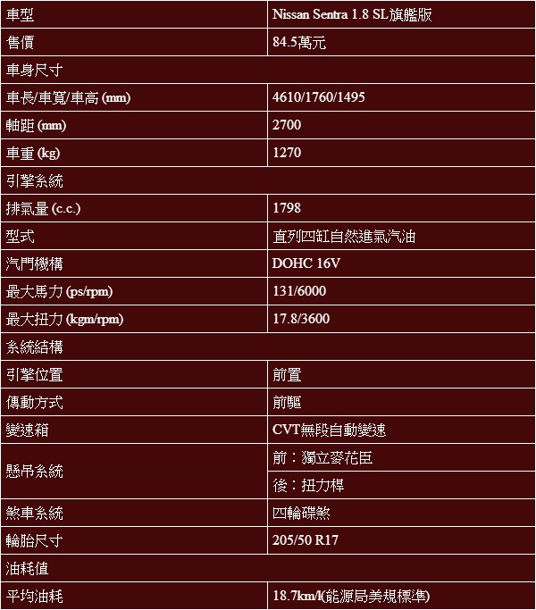 不可否認,在此之前,Nissan於前一個世代Sentra結束銷售後,便轉以Tiida與Bluebird兩線夾擊的方式,企圖一網打盡該級距所屬消費者的心,從結果論,擁有小排量、大空間優勢的Tiida確實一戰成名,但排氣量達2.0升、已跨越更高一級臺灣牌照稅與燃料費課稅標準的Bluebird,則顯然落得鎩羽而歸的下場;現在,全新Sentra上市絕不可能重蹈覆轍,改以1.8升直列四缸汽油自然進氣引擎作為動力單元的這輛主力中型房車,擁有6000轉下131hp、3600轉下17.8kgm的最大輸出值,搭配無模擬檔位功能的CVT無段變速系統後,所提供的加速感受是屬於平和順暢的那種,它不會過於遲緩、好像拖不動車身般窒礙,但也不會流於躁進唐突,而呈現出一種適切的感受,即便切入S檔運動化模式,也只是提供如傳統自排車延遲升檔的感受而已,習於日系國產車那種輕盈油門反應者,或許會覺得不夠輕快,不過只要習慣Sentra的加速習性,倒也不覺較其他1.8升對手慢上多少,更重要的是,這輛國產中型房車依照經濟部能源局美規測試標準,平均每公升汽油可以行駛高達18.7公里距離,足以令車主省下相當可觀的行駛成本。