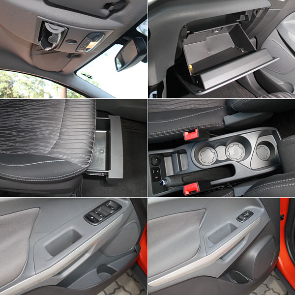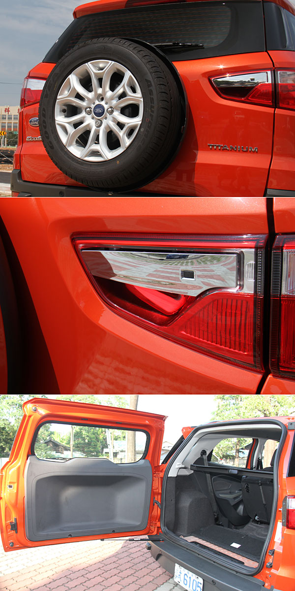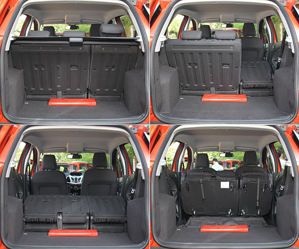 收納機能是EcoSport另一個值得誇讚的長處,原廠宣稱,在EcoSport車室內,有著多達20處的置物空間,雖然在緊湊的試車時間內無法一一細數,不過從副駕駛座下的置物盒、頂篷的眼鏡盒、前後門板置杯處等設計,這貼心之意相信可獲得肯定。此外,休旅車該有的後廂置物機能,搭配6/4分離的後座椅等,將後座椅背傾倒並翻起後,還可達到705公升容積,不過側開式的尾門需要更多的操 座空間,這點在停車時,是要注意的部分。