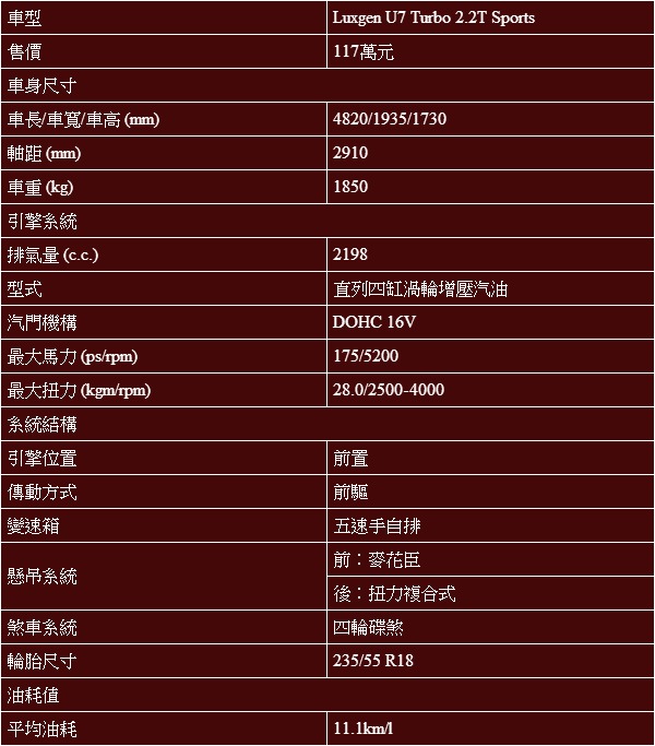 駕著車上路,U7 Turbo Sports擁有與小改款前一模一樣的動力配置,2.2升直列四缸渦輪增壓引擎,可榨出 5200轉下的175匹最大馬力以及2500-4000轉下28.0公斤米最大扭力,搭配Aisin的五速手自排變速系統,提供同級國產車中屬一屬二的澎拜動力輸出,就這部分來說,U7 Turbo Sports肯定是沒有任何問題的,從起步開始就能讓人感到力道飽滿,加速與再加速時推力依舊源源不絕,即便車重超過1.8噸,依舊無法阻擋U7 Turbo Sports貫徹奔馳的決心。