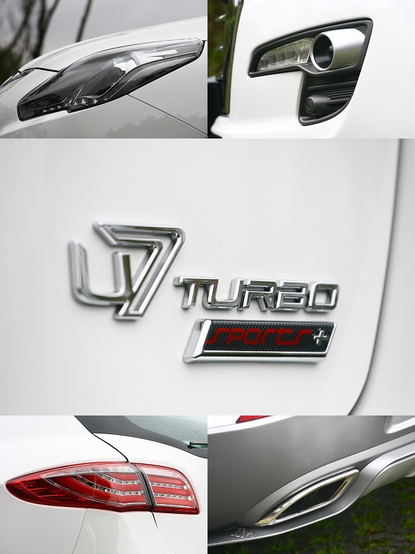 今天我們所拿到的是二輪驅動的U7 Turbo Sports,簡單的說就是最頂級二驅版的空力套件版本,分成兩部份講,首先,U7 Turbo雖說定義上屬於Luxgen 7 SUV的小改款車型,不過比起一般國產車的小改款動作,U7 Turbo的變革顯然幅度大上不少,從車頭看上去,包括頭燈組、水箱護罩、保險桿、霧燈與氣壩都進行了更新手段,現在U7 Turbo的錢臉造型更加洗練簡潔,也更符合新世代汽車設計潮流;車側部分,Luxgen則以霧銀色車頂飾條的運用(最入門版本則無),取代原本的車頂架設計,而車門下緣也導入了浪板的設計,加上新款鋁圈協助妝點,讓側方線條更顯順暢;至於車尾部分則理所當然將尾燈組輪廓與內容稍作更動,加上保險桿下方的類分流器造型設定,與新式樣的左右雙出尾飾管一齊提供更加動感視覺印象。