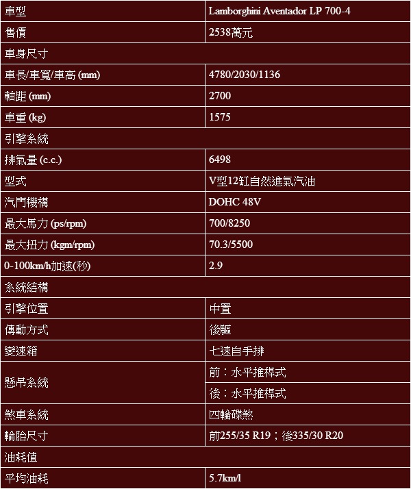 在街頭開這樣的超跑,那天中了樂頭頭彩,買來第一天千萬不要就一股腦也想要與路人分享V12引擎咆嘯,Aventador LP 700-4的動力數據是700匹/8250轉與70.3公斤米/5500轉,確實高轉速才能發揮這頭蠻牛的真本領,但是想探究它的實力,本身也得擁有相當的駕馭程度,如果你也擁有這般駕馭能耐,就會知道在市區讓這種車火力全開是多危險的一件事,雖說現在連超跑也有多到數不盡的主動安全配備呵護,聽我勸,如果那天你也有幸駕著Aventador LP 700-4上街,就慢慢遊車河多享受些路人所投以的艷羨目光就好,原地拉轉這種膚淺的動作,交給改砲管的國民車處理便可以。