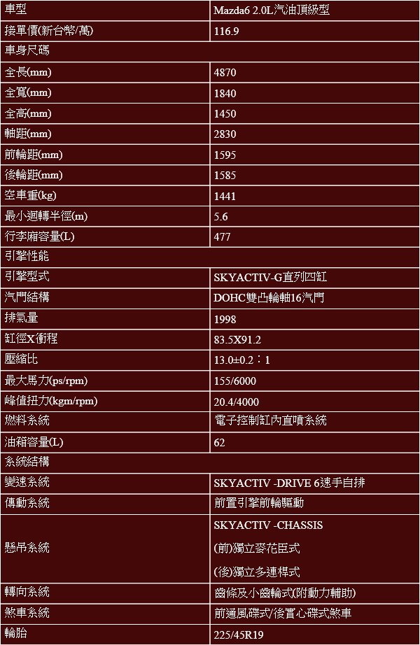 Mazda6 2.0汽油頂級型基本規格表