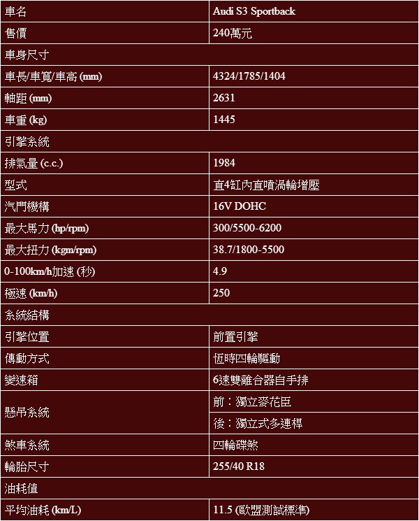 Audi S3 Sportback基本規格表:
