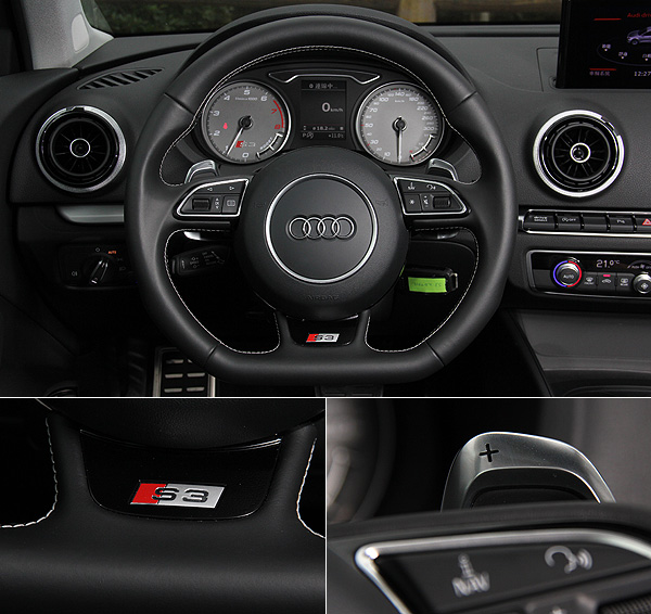 平底3輻式方向盤配合專屬徽飾與加厚的換檔撥片,以及儀表板內的S3徽飾,也散發不凡。