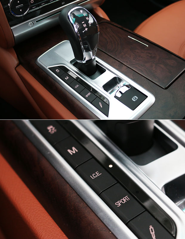 排檔座一側,提供駕駛模式介面,具備I.C.E.增強型控制與節能模式、SPORT運動模式(可針對加速、引擎反應、MSO介入控制、排氣閥門控制、換檔速度等介面優化)等功能。另外提供M手排模式與懸吊系統切換功能。