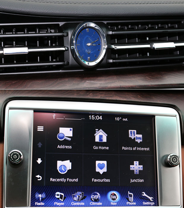 中控台中央的針式時鐘,與整合了導航、收音機、CD/DVD影音、SD記憶卡讀取、USB、Aux-in、iPhone、藍牙功能、多媒體播放、中央空調、車載電話、車用電腦等多功能於一身的Maserati Touch Control觸控面板,展現科技與傳統並蓄的特色。