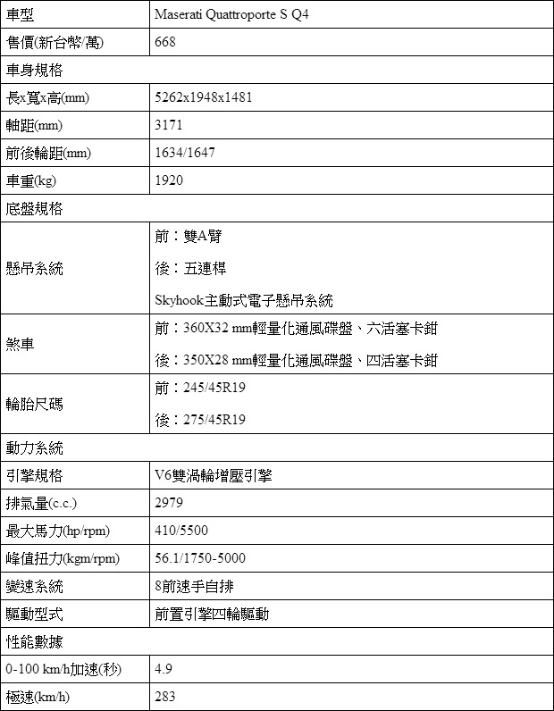 此次長征中,除了先前介紹的Ghibli S Q4以外,搭載相同動力系統的Quattroporte S Q4也是另一重點,售價為新台幣668萬元。