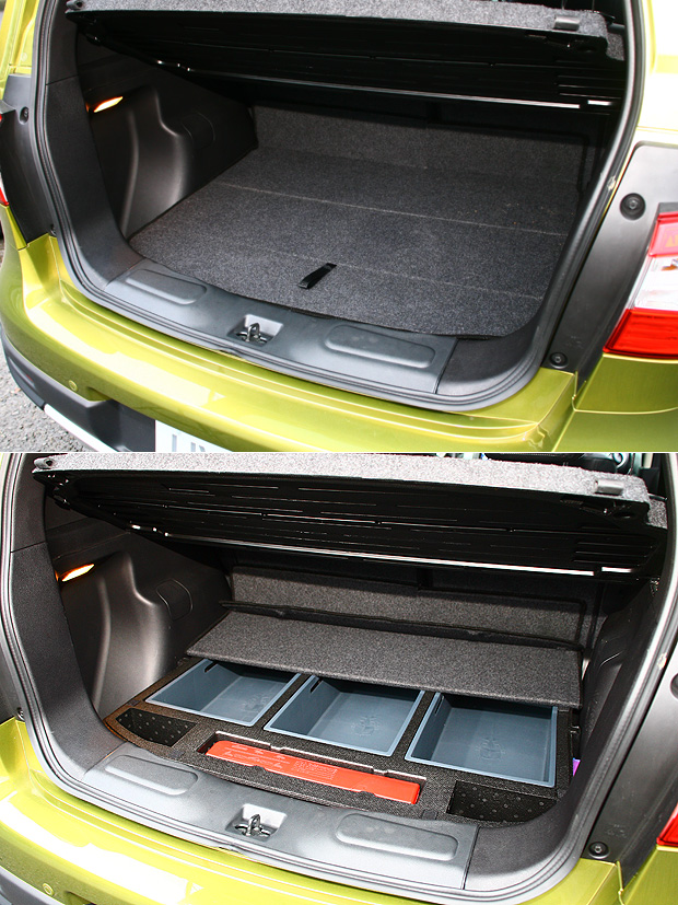 由於Colt Plus軸距較Livina稍短100mm、後座空間也略微窄小之故,雖然車行尺碼略小,但Colt Plus可以提供79公分的行李廂深度,較Livina增長2公分也就是20mm之多。但最寬處129公分、最窄處79公分的寬度,以及84.5公分的行李廂高度也能提供380公升的行李廂容積。而具有6/4分離傾倒功能的後座椅背,則可將行李廂深度拓展至163公分之譜。另外,Colt Plus豪華型與旗艦型所標配的後座椅背一鍵快速釋放裝置,還有高低可調的行李廂隔板,則能讓Colt Plus擁有更具彈性的行李廂空間。