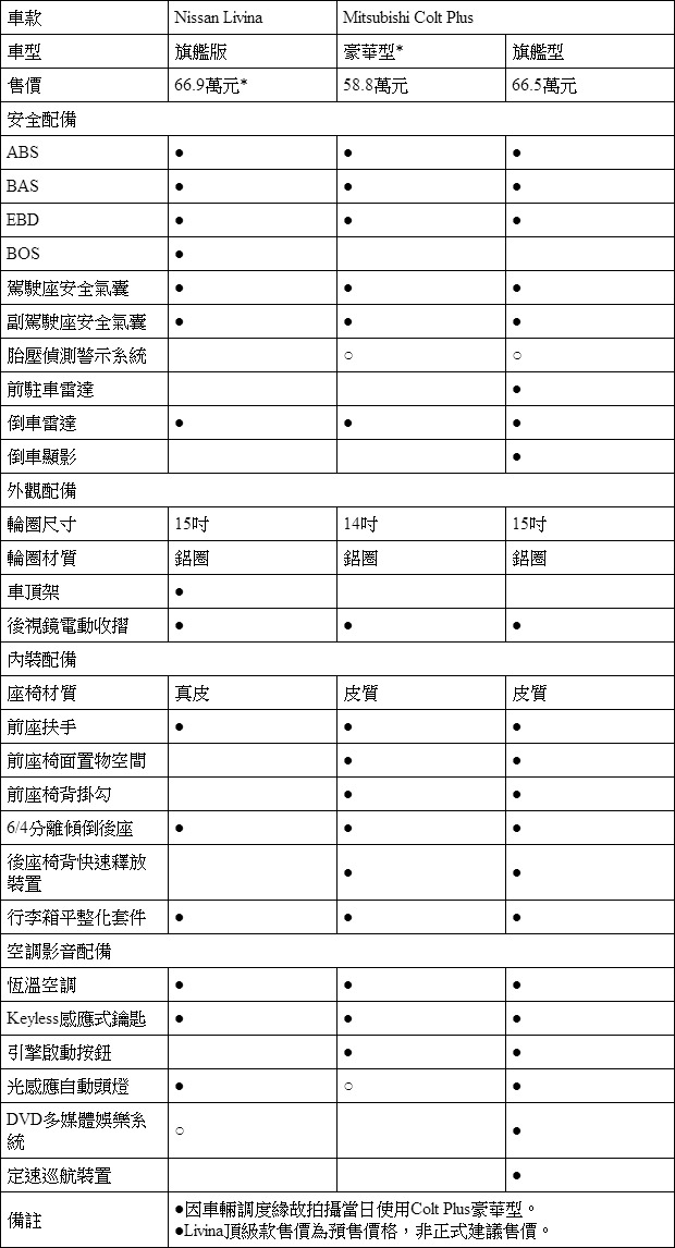 Nissan Livina、Mitsubishi Colt PLus配備比較表:
