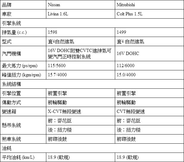 Nissan Livina 1.6L與Mitsubishi Colt Plus 1.5L動力系統基本規格表: