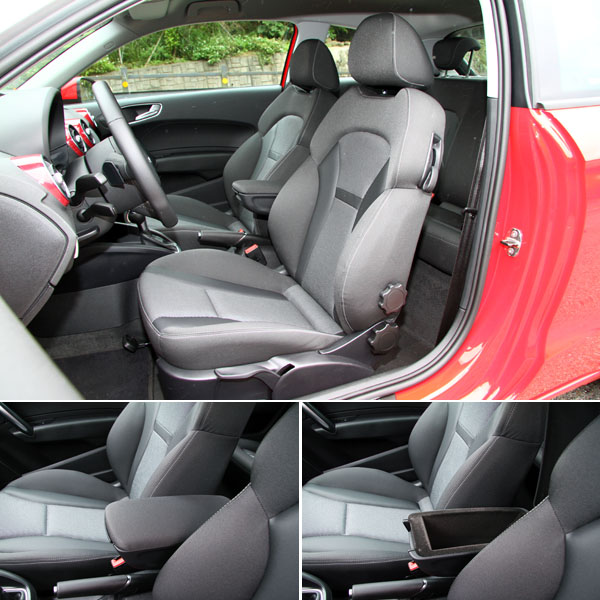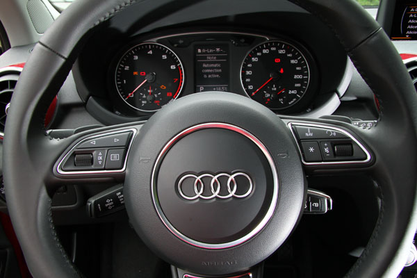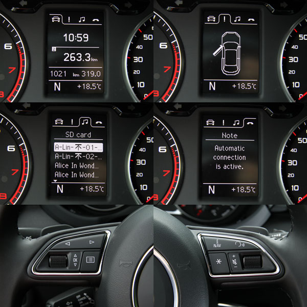 進入A1的座艙中,它仍舊還是保有Audi一貫的低調、簡單風格, 除了與車身同色處理的冷氣出風口飾環,沒有任何稱得上花俏的裝飾與設計,不過當我們仔細地觀察與觸摸各部品,就會發現A1車內的用料質感相當了得,即使整體還是以塑料為主要材質,但是利用壓花與軟硬度上的不同,搭配出層次與不錯地觸感,再加上類金屬飾件與真皮方向盤等,使得A1的質感部份甚至有勝過同門師兄的水準;略偏向駕駛座的中控台設計,則是表達出它重於自駕者的使用性;本次試駕Ambition高階車型,除了標配Concert 音響主機,還搭配了多媒體連結套件〈包含以下:藍牙免持通訊裝置、Audi Music Interface數位音樂介面(MP3/iPod/USB 2.0)、第二組SDHC讀卡機與藍牙無線音樂傳輸功能〉,加上空調系統,所有操作資訊都會顯示於6.5吋可收折彩色螢幕,其中音響系統的操作邏輯與MMI介面相仿,因此,操作上在經熟悉後還算容易上手,不過不得不還要再囉唆一次,中文化介面究竟還要等多久??但儀錶板中DIS駕駛資訊顯示系統則已經有中文曲目顯示功能。
