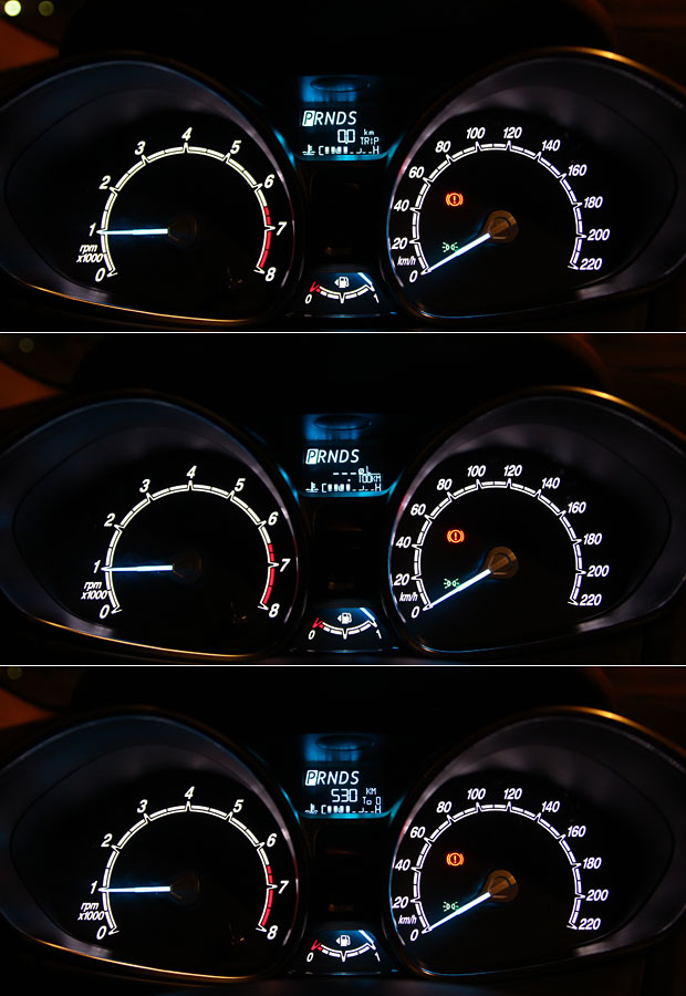 取車後,以油槍跳停的方式加滿油後,將里程數、平均油耗歸零,此時旅程電腦顯示可行駛距離為530公里。