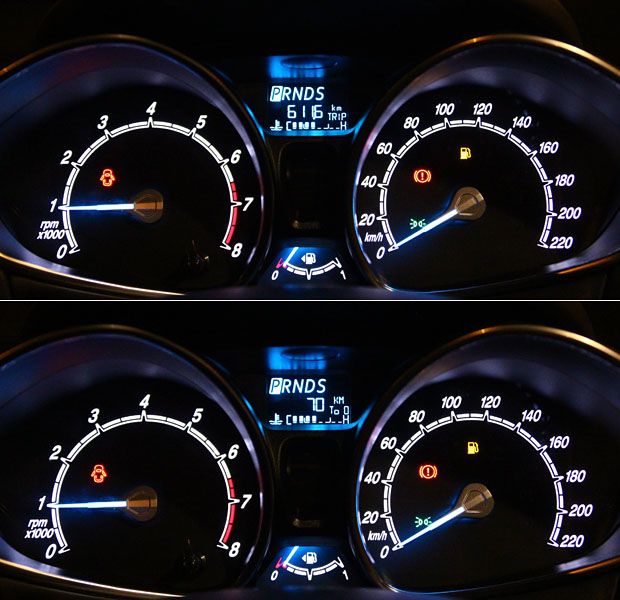 累積里程到了611.6公里之後,油表接近貼底、油燈也已亮起,此時儀表顯示還可行駛70公里,考量夜間行車安全,此時添補油料。