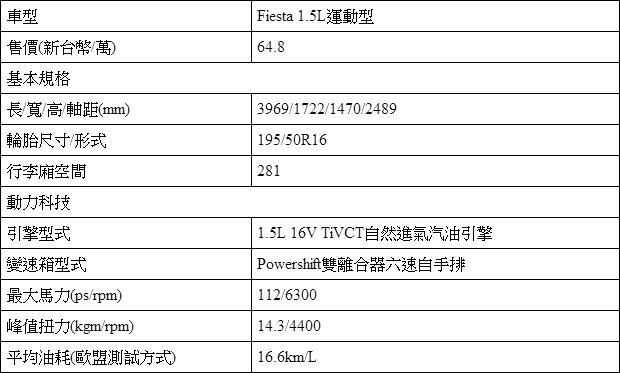 Ford Fiesta 1.5L基本規格表