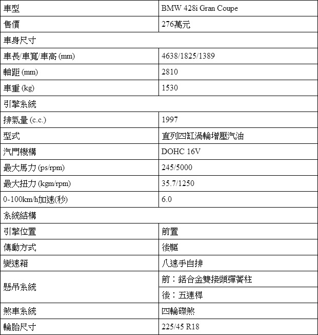 由於此次試駕規畫中,原廠提供的完全都是428i Gran Coupe M Sport Package,因此這篇報導會全然以這輛車的動態表現為主,與其他所有28i系BMW相同的,428i Gran Coupe車頭所擺放的,依舊是那具2.0升直列四缸渦輪增壓汽油引擎,最大馬力為5000轉下的245匹,最大扭力是1250轉下的35.7公斤米,搭配八速手自排變速箱後,0-100km/h加速僅需6.0秒便可完成,電子限速理所當然在250km/h,原廠平均油耗數據則為15.87km/l。