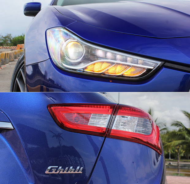 蔚為嶄新家族設計的前臉設計,在Ghibli的身上,透過水箱罩的梯形角度、更為侵略性的頭燈搭配,與「凹」字型的下氣壩,融合成不遜於當家跑車GranTurismo般的跑格與吸睛度。