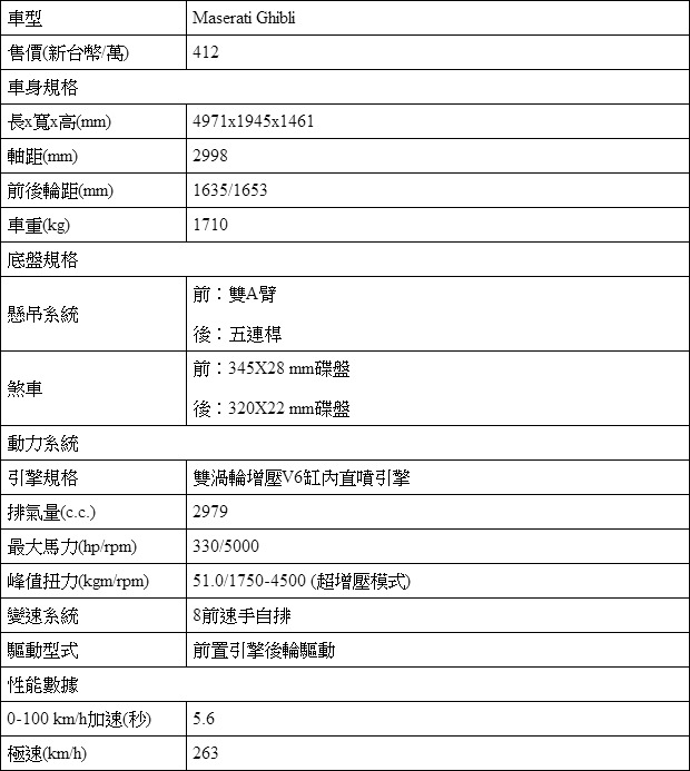 Maserati Ghibli五視圖與基本規格表