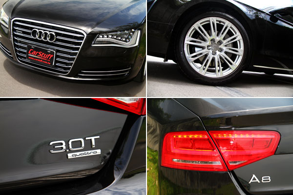 相較於前次試駕的A8 L 4.2 FSI,短軸版的A8 3.0T即使車長少了130mm,不過還是有著超過五米、達5137mm的車身長度,仍舊符合台灣消費者對於大型豪華房車於尺碼上的胃口,而且在緊致的線條下,並不容易分辨出兩者的的差異,在車陣中依舊是份量十足,不過若是仔細觀察,短軸版車型在B柱之後至C柱下滑車頂線條還是略短於長軸車型,整體側面曲線在略為縮短後,所表現出來的外型卻更為協調,此外,車側鈑件銳利的折線對於將身型緊縮得更苗條富有力度仍扮演著關鍵的角色,也撐起了整輛車的線條主軸與層次。