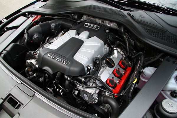 回歸駕駛感受的部分,本次試駕的短軸版A8 3.0T搭載了與S4、S5相同的3.0L V6機械增壓引擎,不過動力輸出上略調降為290hp與42.8kgm,變速系統則與V8車型相同採八速tiptronic自排變速系統,雖然動力數據不若4.2 FSI車型亮眼,不過在實際試駕時卻發現整體動力表現卻沒有太大的落差,相較於4.2 FSI車型搭載地4.2L V8引擎,其所搭載的3.0L V6機械增壓引擎,自2500-4800rpm間都可輸出42.8kgm的最大扭力,在動力輸出上顯得相當靈巧,4.2L V8引擎則是以順暢穩定輸出見長,中低轉速不若3.0L V6機械增壓引擎來得活潑,兩者間的差異必須到拉尾速時才會有比較明顯的差異,在絕大多數的路況下,A8 3.0T的動力表現即將當充足夠力。